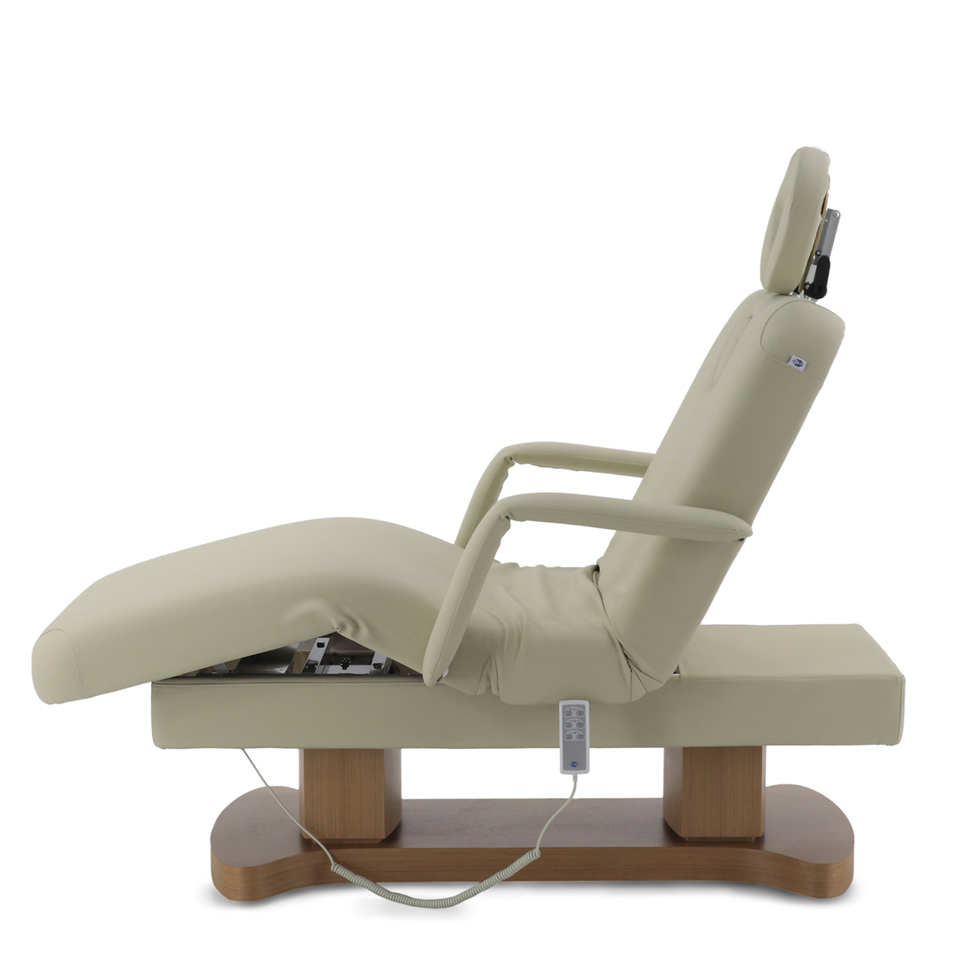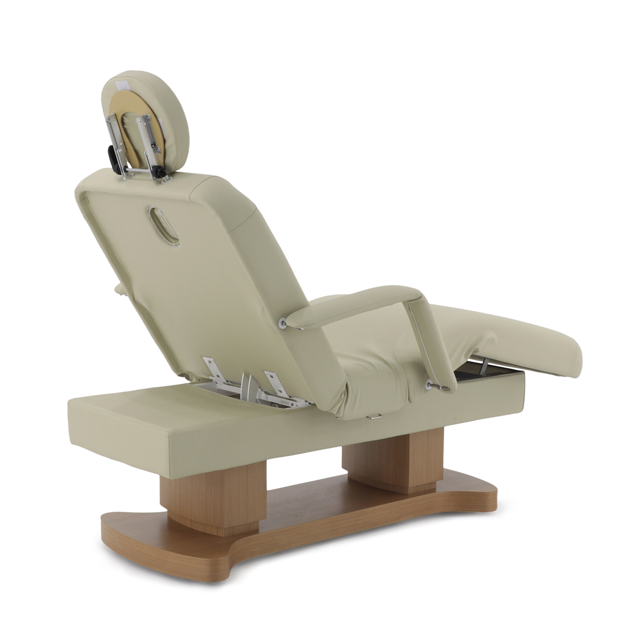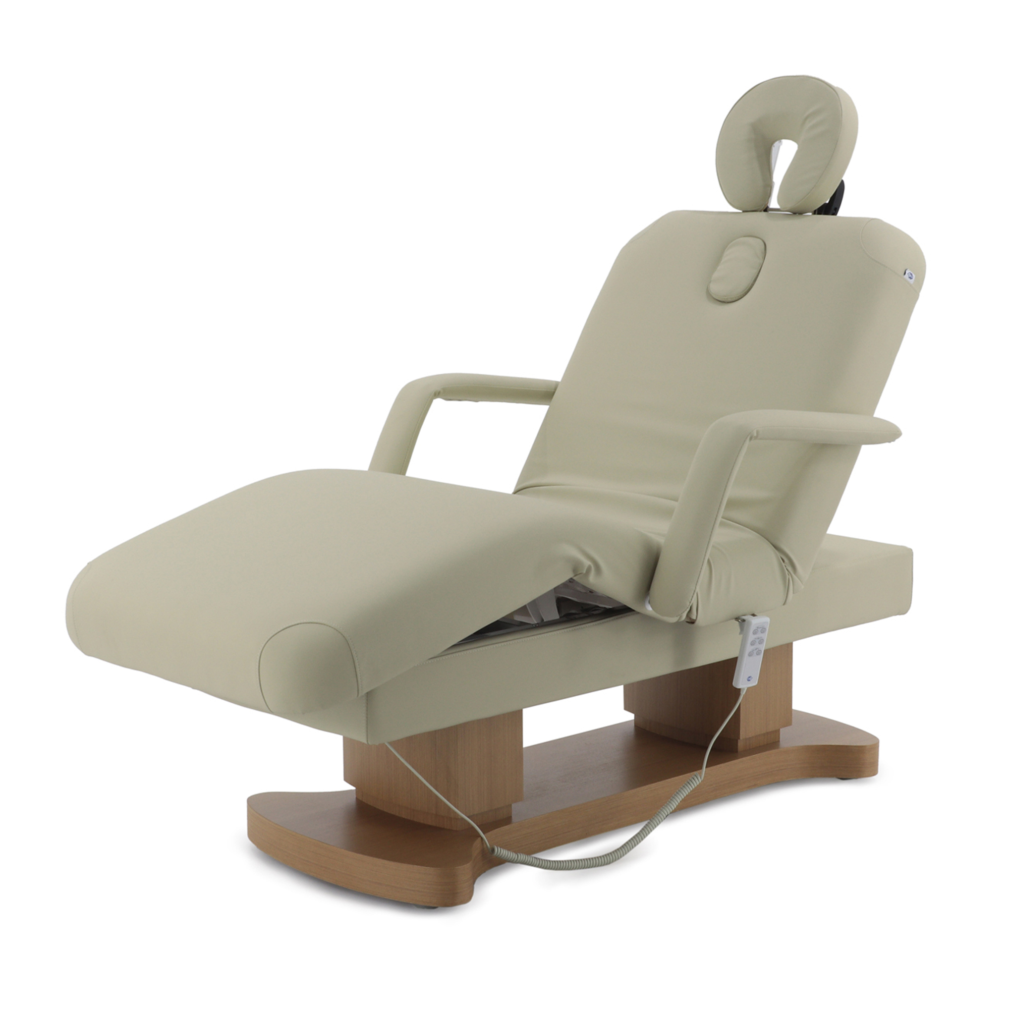 - Исключительная комфортность: просторное ложе с анатомическими секциями, отверстием для лица, комплектом мягких аксессуаров и подлокотниками обеспечивает глубокое расслабление клиента.